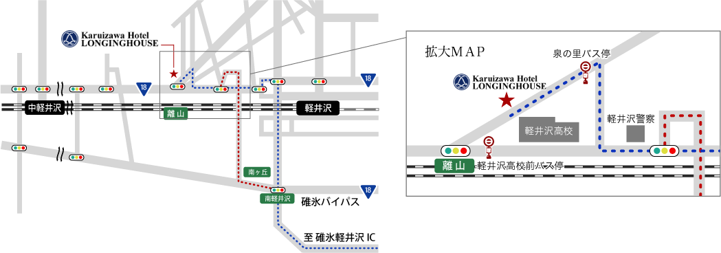 碓氷軽井沢IC方面より当館へ起こしの際には、青い点線の経路でお越し下さい。
