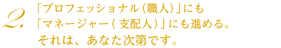 持ち回りでいろいろなポジションを習得できるから、オールラウンダーであるマネージャーを目指すか、1つの業務を極めていく、その道のプロフェッショナルになるかは、あたな次第です。適正とあなたの希望で、早くて2年目から、あなたの進みたい道にシフトしていきます。