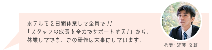 当社は、社員40名の小さな会社。大きな組織の中で、限られたを限られた責任でする、という働き方とは180度違います。私たちが大切にしていることは、言葉遣いや身のこなし方を画一的に整えるよりも、「来てくれた方に喜んでいただけるおもてなしとは何か」を自分で考え、実行すること。お客さまが違えば会話の仕方も違っていいと、私は思うのです。滞在型のリゾートホテルを選ぶお客さまは、リラックスできる環境を求めています。マナーにとらわれすぎず、ビジネスライクになりすぎず、私たちなりの一生懸命さでお迎えしたいのです。